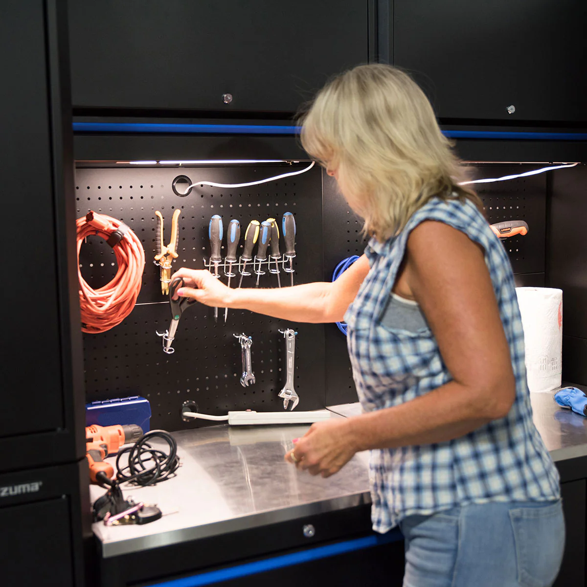Use the pegboard back wall along with the matching posts in order to attach a base cabinet to a wall cabinet for even more frustration-free assembly. The pegboard provides a place to hang your most-used tools for easy access.
